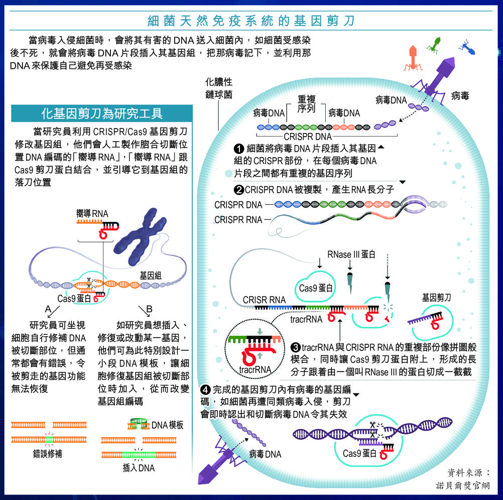 【諾貝爾獎 化學獎】中國科學家賀建奎兩年前宣佈以CRISPR/Cas9基因剪刀技術,製造世上首對經過基因編輯的雙胞胎,引來滿城風雨,但也反映這種面世不足十年已在全球廣泛使用的技術,潛力是多麼巨大。今年諾貝爾化學獎也頒給研發基因剪刀的歐美兩名女科學家,令她們成為歷來第六和第七位女性得化學獎。