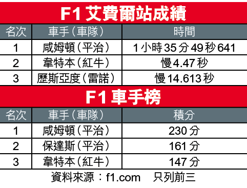 【F1 艾費爾站】【綜合德國外電】周日上演的F1艾費爾站正賽,排第二位出賽的「黑帝」咸姆頓,以1小時35分49秒641完成60圈的賽事,力壓紅牛車手韋特本以及雷諾車手歷斯亞度再贏一站,更成功追平了「車神」舒密加累積的91個分站冠軍紀錄。