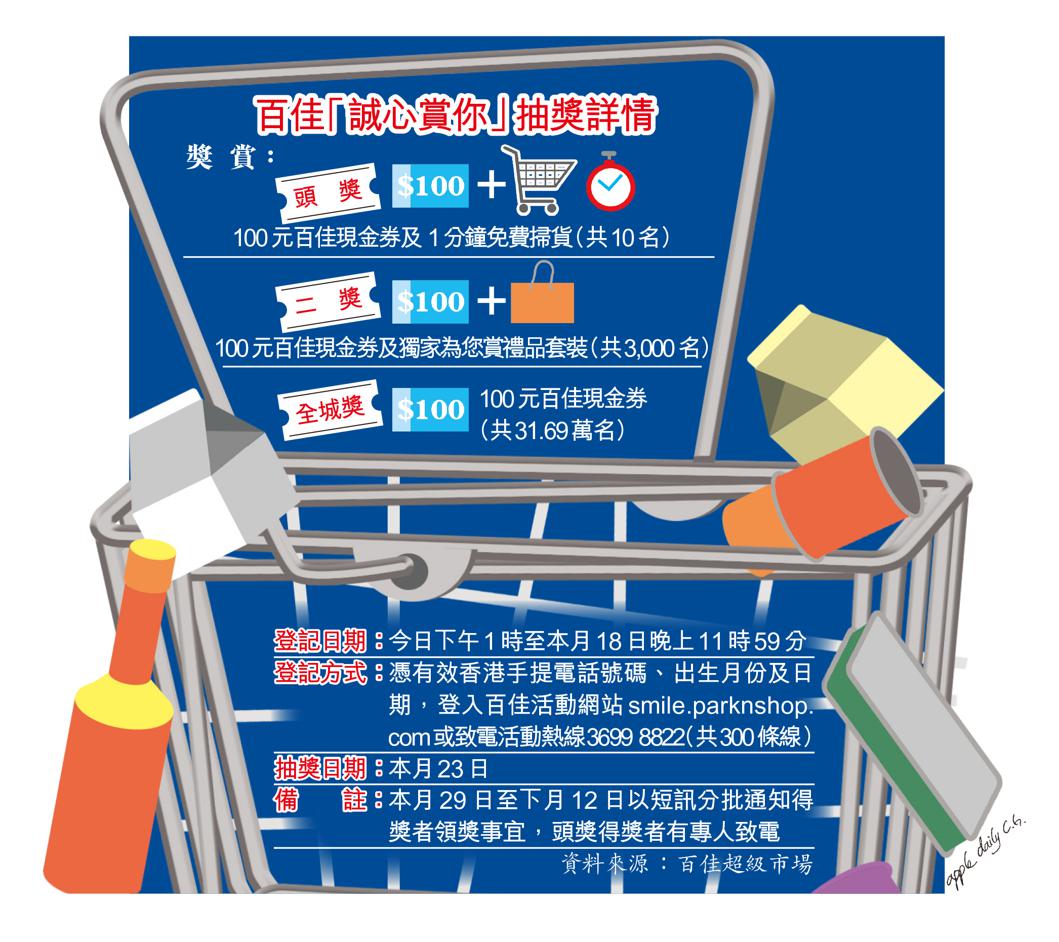 百佳昨公佈超市回饋計劃大抽獎的細節,市民可於今日下午1時起至下周日晚上11時59分期間,登入百佳活動網站或致電熱線,以流動電話號碼和出生日期登記參與抽獎,毋須填寫姓名和身份證號碼,百佳將於本月23日進行電腦隨機抽獎。