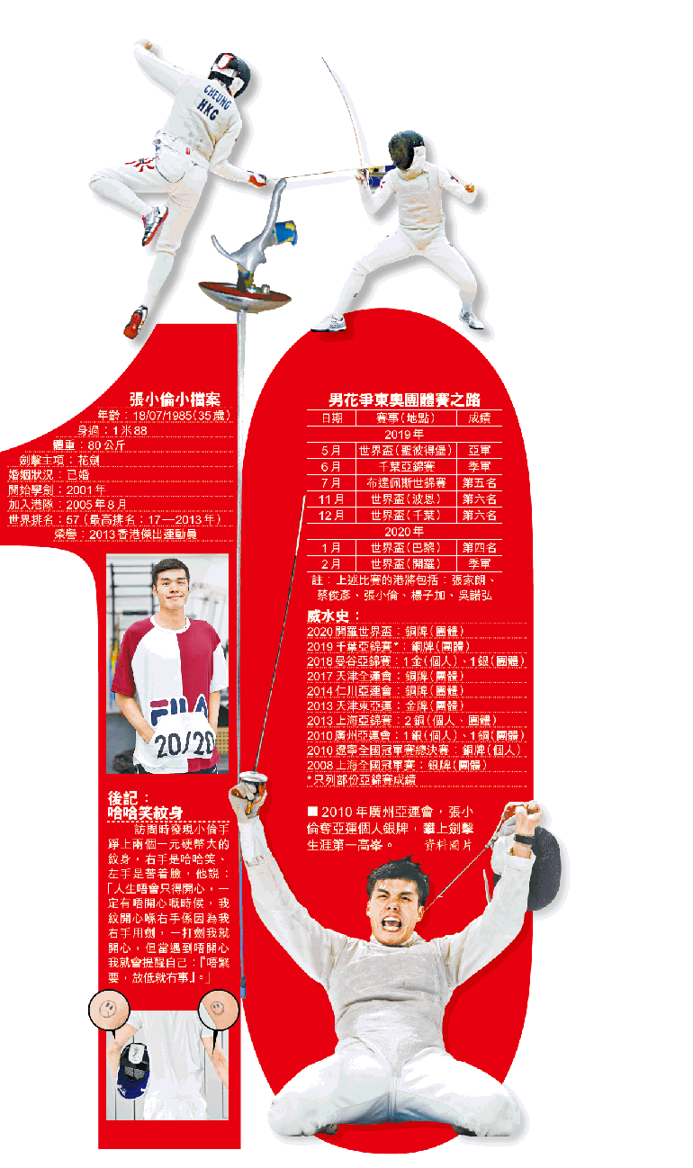 「如果唔係東奧延期,家陣應該拎住奧運獎牌度緊蜜月。」做奧運夢的人多的是,但他敢做奧運獎牌夢,10年前奪廣州亞運花劍個人賽銀牌的張小倫,等這張東京奧運入場券足足10年,由以前廿多歲到現在35歲人夫,儲夠實力衝牌,懶理世紀疫情,天天努力操「弗」自己去迎接個人第一個奧運會。