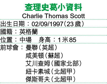 23歲的查理史葛曾代表紅魔不同年齡梯隊至U23參與英超預備組聯賽,其間曾短暫外借到蘇格蘭超聯球隊咸美頓,至2018年離開曼聯後,輾轉效力於不同球隊,至今季加盟愉園。