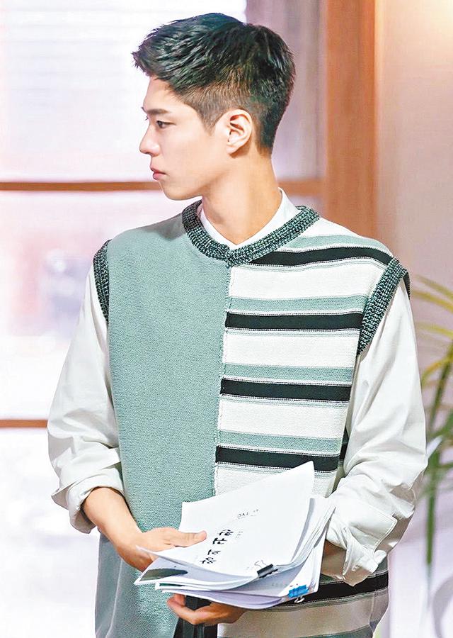 朴寶劍有貴公子氣息,穿起針織服飾,別有一番書卷味。第8集中穿上近季大熱的oversized針織背心,來自韓國設計師品牌Ordinary People,不對稱的設計充滿特色,搭配白色恤衫,散發出90年代復古校園風。另外又穿上Ralph Lauren菱格圖案cardigan,配上T-shirt與藍色chino pants,休閒率性卻帶復古氣息。