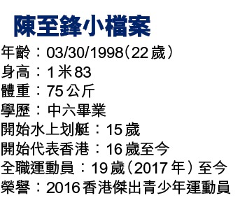 讀過兩間中學的阿鋒,2017年中六考完DSE後已展開全職運動員生涯,亦爭得2018雅加達及巨港亞運公開組單人艇入場券,雖未能站上頒獎台,但從那時起已將2020東京奧運放在心內,但武肺令大部份人損手爛腳,惟獨陳至鋒從中「獲利」。
