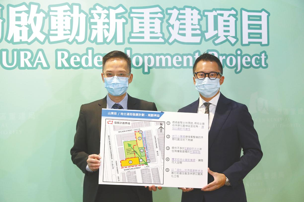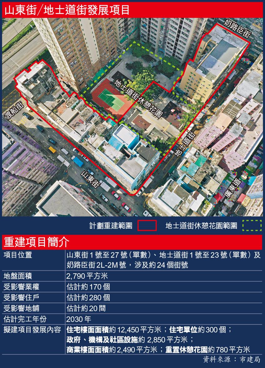 【本報訊】市建局宣佈啟動旺角山東街/地士道街重建項目,地盤面積約2,790平方米,估計有約280個住戶和20間地舖受影響,共涉170個業權。項目預計可建300個私人住宅單位,預計2030年完成。市建局稱,重建項目涵蓋位於地士道街旁的部份休憩花園,花園現時被周邊樓宇包圍,位置隱蔽,局方聲稱可透過重建改善該幅休憩用地。