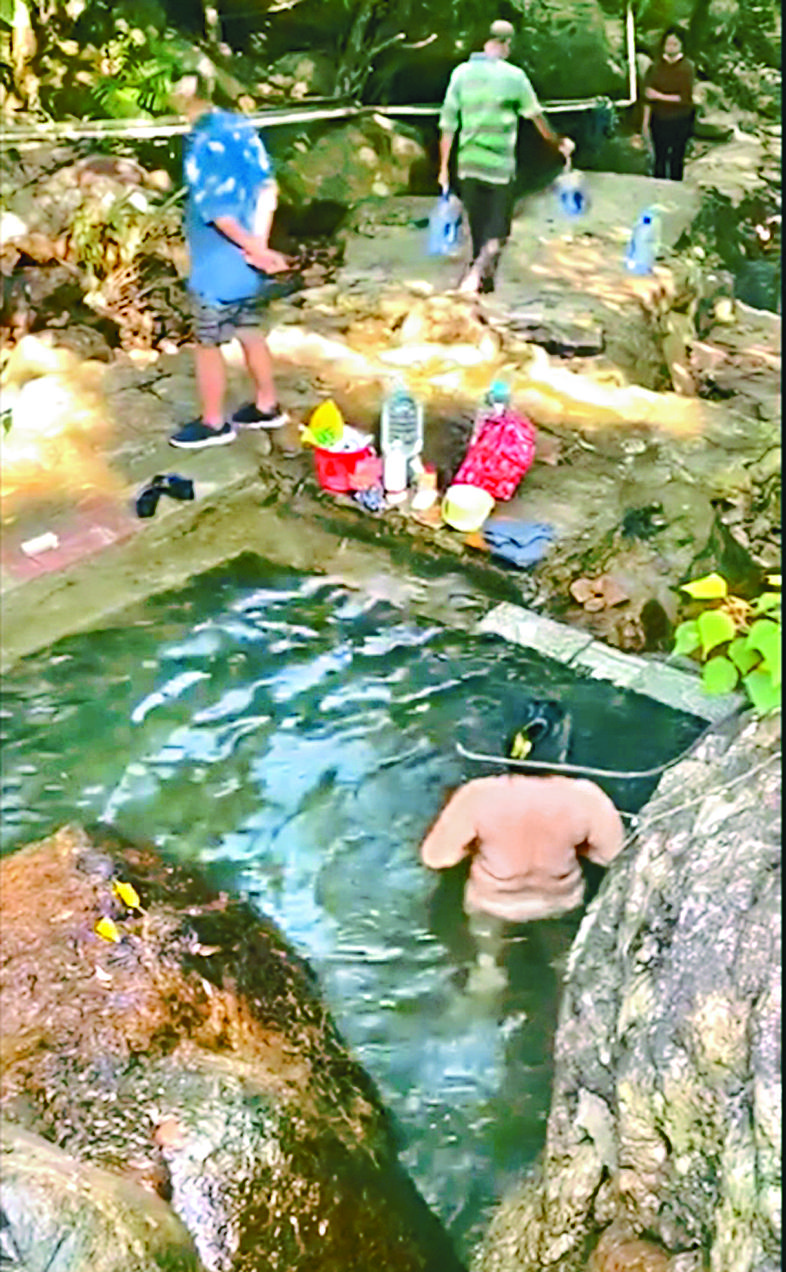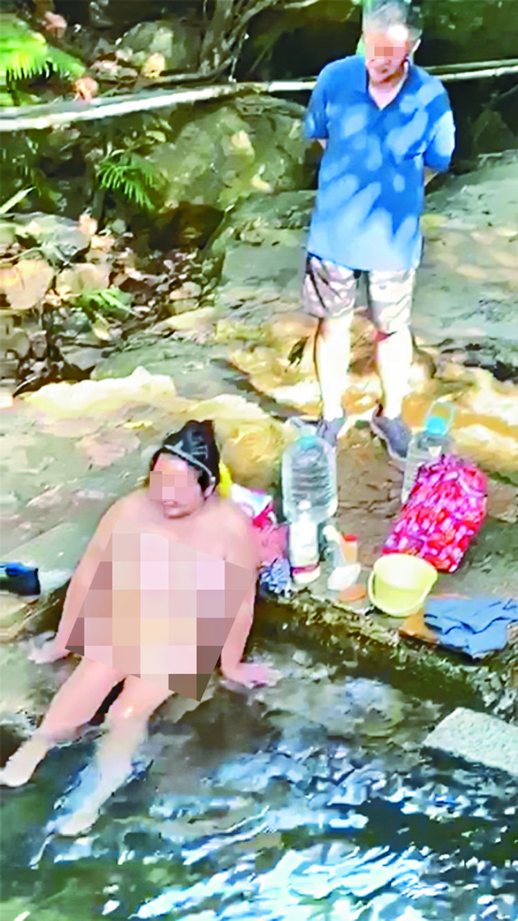 【本報訊】香港山澗變露天風呂?網上近日瘋傳一段大媽浸浴短片,片中大媽光天白日下,上身赤裸在一個山泉內浸浴,被拍片者指「點可以咁樣㗎,簡直污染香港!」短片在網上及多個行山群組瘋傳,網民就事發地點熱烈討論,形容是她的「私家浴室」、「香港華清池」,有網民估計山泉是在沙田水泉澳邨配水庫對上位置,批評大媽浸浴不衞生,又可能污染環境,希望市民不要仿效。