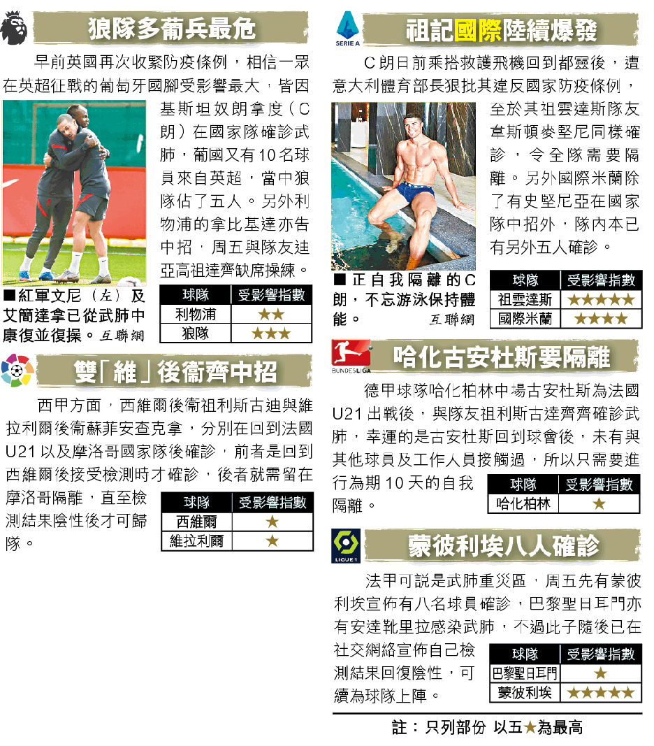 經歷了兩周的國際賽期後,各大國腳都需返回球會報道並備戰接着上演的聯賽。只不過在過去這段國際賽期間,不斷有球員在國家隊確診武肺,令歐洲各大球會需面臨有球員確診的情況。