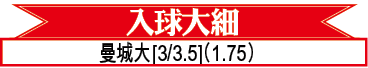 周三歐聯首輪C組賽事,英超勁旅曼城主場迎戰上季葡超冠軍波圖。藍月今季在聯賽的開局不算理想,不過最近各項賽事三場不敗,而且剛於聯賽擊敗阿仙奴,令球隊士氣大增。面對在今夏轉會窗失去主力球員且後防不穩的波圖,相信藍月可以一場大勝打開小組賽勝利之門,一於捧「入球大細」[3/3.5球]的「大」。(球賽編號:星期三31;now644及有線661台明日3:00am直播)