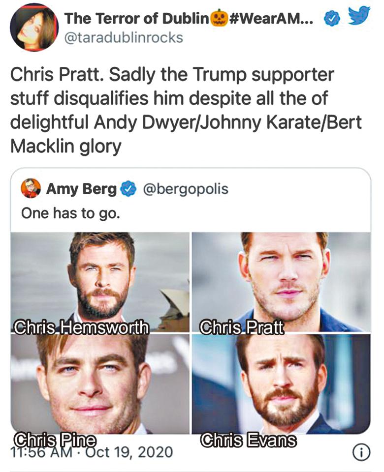 美國總統選舉在即,「星爵」基斯柏特(Chris Pratt)慘遭美國網民狙擊,話說一位電影人 Amy Berg於twitter貼出影壇四個Chris,包括基斯柏特、「雷神」基斯咸斯禾夫(Chris Hemsworth)、基斯派克(Chris Pine)與「美國隊長」基斯伊雲斯(Chris Evans)的相片,並表示:「其中一個要走。」結果就引發網民熱烈討論,不少人都表示基斯柏特要走,因為他沒有公開表態支持哪一名總統,也未有跟隨其他Marvel英雄齊齊撐拜登(Joe Biden),於是就被屈成特朗普(Donald Trump)支持者。加上他之前曾支持一間教會,而該教會又被指反LGBTQ(非異性戀者),所以網民都稱他為「最差的荷李活Chris」。