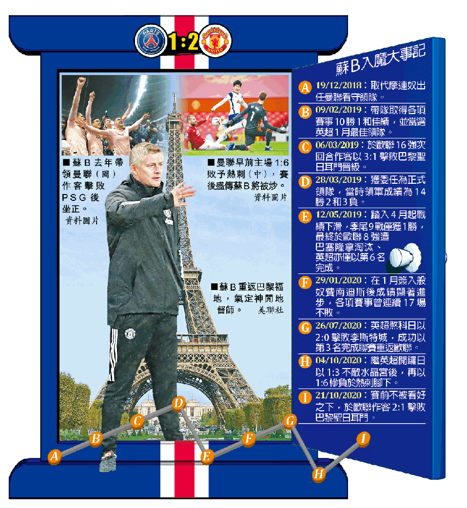 約兩星期前,曼聯在英超於主場慘敗1:6,領隊蘇斯克查該被辭退的聲音不絕於耳。周三歐聯分組賽H組首輪,蘇B與紅魔重返福地作客巴黎聖日耳門(PSG),被看淡下爆冷贏2:1。一年半前曼聯殺敗PSG奠定蘇B坐正;如今再次在王子球場取勝,及時的三分締造球會史上首次作客10連勝,蘇B帥位馬上又得以暫時加固。