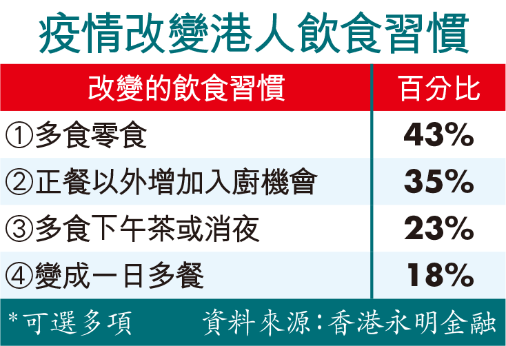 【本報訊】武漢肺炎不但撼動全球經濟,也改變了港人飲食習慣。一項調查顯示,由於減少外出及在家工作的關係,四成受訪市民吃多了零食,當中薯片、餅乾和雪糕成為港人抗疫零食三寶,平均一星期吃三次,九成半人日吃四至五餐。六成市民更表示疫情穩定後,最想放肆地吃自助餐與放題。但口腹之慾要付出代價,五成半人疫情期間增磅變胖。