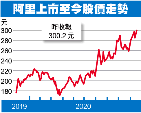 中薇證券研究部董事黃偉豪指,除螞蟻招股進入倒數,阿里每年重點活動「天貓雙11」的首日數據理想,令市場憧憬阿里銷售成績,正是推升其企上300元的主因。由於該股「冇蟹貨」,故他表示難以估位,「初步都是每50元逐步望上去」。他指重倉投資者可在高位「部份食糊」,想再上車就可待股價回調至280元才出手。