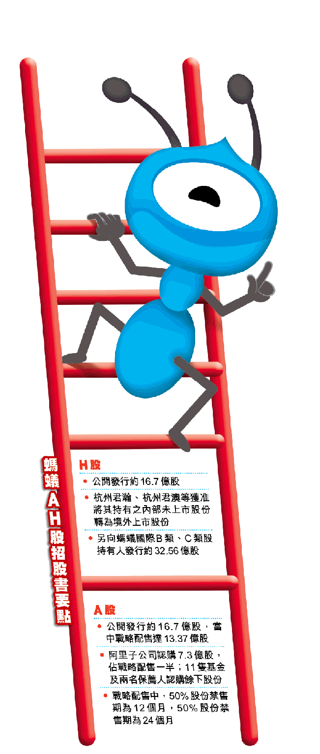 據螞蟻的上市發行公告,AH股各發行不超過約16.7億股,相當於已擴大後股本約11%。A股參與戰略配售的投資者,50%股份禁售期為12個月,50%股份禁售期為24個月,堪稱科創板成立以來最嚴格的安排。公告又指,H股發行尚待香港聯交所批准,是次除了公開發行新股,集團亦向螞蟻國際B類及C類股份持有人發行32.56億股。