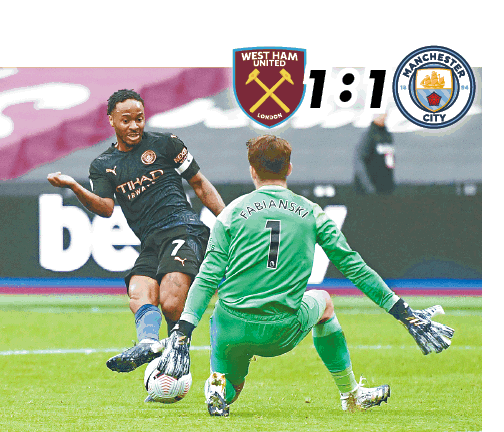 曼城在68分鐘換入迪布尼希望反先,這位比利時中場80分鐘有次罰球機會,可惜角度太正中被法比安斯基沒收,86分鐘曼城更錯失黃金機會,迪布尼放直線交給史達寧,可惜後者右腳施射被救出;補時階段更有馬列斯的射門被救出中柱不入,最終只能與韋斯咸打成1:1平手,各得一分。