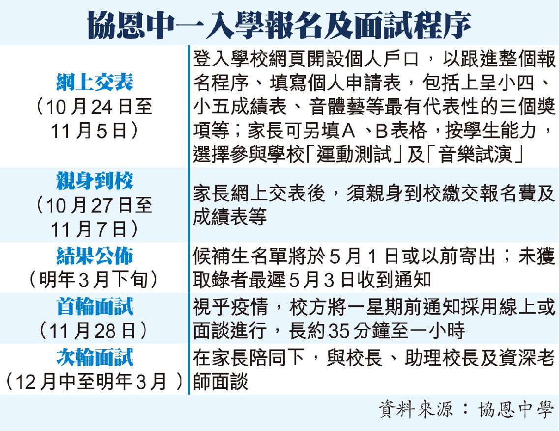 協恩提供180個中一學額,應試學生須參與筆試,首輪面試11月28日舉行,悉數面見所有申請人,疫潮下可能改用網上形式進行。個人面見環節,老師將透過不同問題了解學生表達、理解、解難、運算、創意等能力。協恩的音樂、體藝比賽表現一直稱霸學界,簡介會透露,學生若想表現運動能力,可揀選最「拿手」的兩項技能測試。音樂方面,面試會要求學生演繹一首樂章及設視奏部份,最重要看學生對音樂的個人看法。