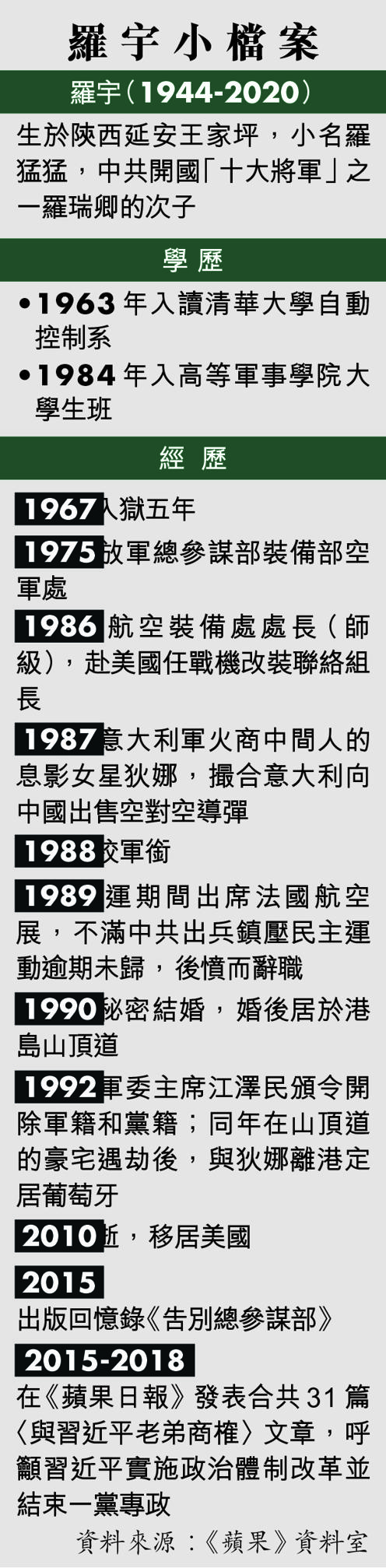 羅宇在1990年藉隨團赴歐出走中國,從此與中共分道揚鑣,兩年後被開除軍籍和黨籍。由於父親羅瑞卿和習近平父親習仲勛相識,近年他在《蘋果日報》發表了合共31篇的 〈與習近平老弟商榷〉文章,直指中國遍地危機的「總禍根就是中共的一黨專政」,認為要讓中國民主化就要解除報禁、黨禁,實行司法獨立和軍隊國家化等。