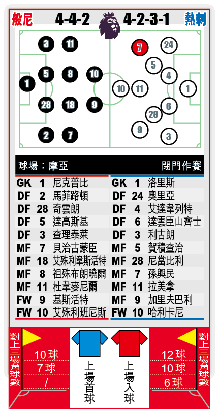 熱刺表現穩步向上,自球季首戰在主場不敵愛華頓後,至今各項賽事九戰不敗,最令人驚喜是一改摩氏泊大巴印象,九場不敗走勢場場有波入,當中近4戰更至少攻入對手3球。今場兩大鋒將卡尼與老孫勢必復任正選,2人今季英超合共貢獻12球加上9次助攻;巴利經過上場歐霸熱身後,摩佬甚至有機會在今仗排出我最期待的進攻三叉戟,要擊敗般尼不成問題。