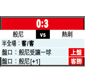 上輪熱刺在開賽16分鐘便領先韋斯咸3:0下,竟在最後10分鐘內連失3球,實在欠運,論該隊近期整體表現絕對不差,加上今季兩場作客比賽全勝兼誇張地共入11球,今訪狀態持續低迷的般尼,淨勝兩球難度不大。