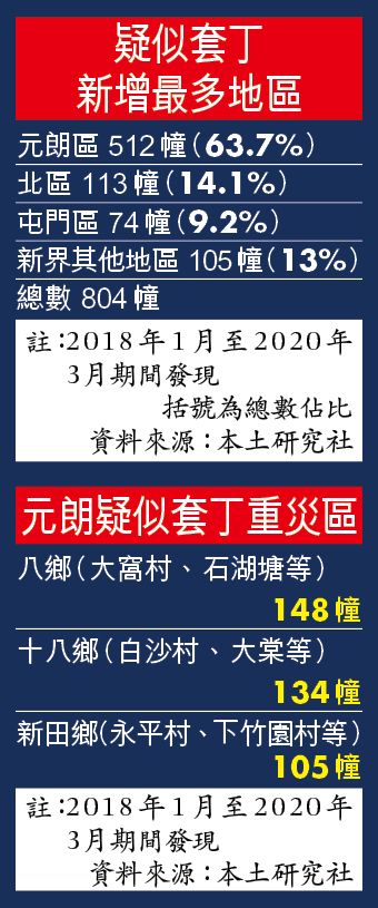 本土研究社繼前年後,推出新一份新界套丁研究報告,指過去兩年幾乎每日均有一幢疑以套丁手法得來的丁屋,前年1月至今年3月,疑似非法套丁丁屋增加804幢,總數由2017年約9,800幢突破至約1.06萬幢。疑似套丁最嚴重的是元朗區,共增加512幢疑似套丁丁屋,重災區依次為八鄉、十八鄉和新田鄉。
