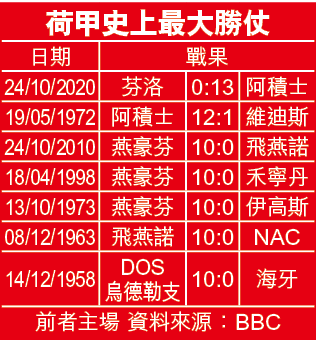上周六晚正當大家睇緊西甲國家打吡之際,同時間荷甲嗰邊出現驚人戰果,班霸阿積士作客芬洛入吓一粒入吓又一粒,結果好似少林足球隊對山西豆腐隊咁收唔到手,結果阿積士大勝13:0,破咗自己保持48年、近半世紀嘅荷甲最大勝仗紀錄!