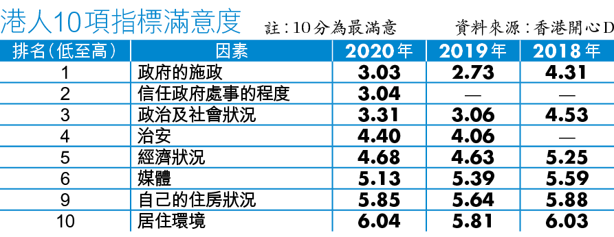 【本報訊】香港自由不再、高官謊話連篇,香港人開心指數去年跌至十年新低的6.15分後,今年維持6.16分低位,遠低於反送中爆發前的6.54分。首三位令港人不開心的外在環境因素均與政治相關,港人最不滿政府施政,滿意度僅3.03分,對政府處事的信任度亦只有3.04分。調查更發現有46%受訪者呈抑鬱情緒。