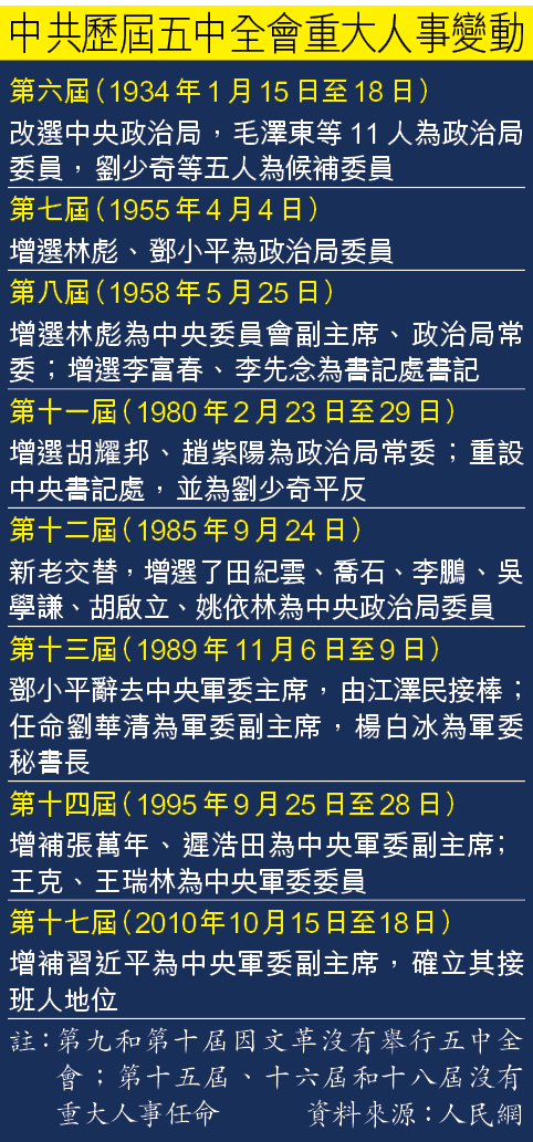 中共每隔五年在秋季舉行一次全國代表大會,改選全體約二百人的中央委員會,黨代會結束後翌日舉行的一中全會(第一次中央委員會全體會議)就會選出作為權力核心的中央政治局及其常委會。雖然每一屆中委會的最重要人事任命都在一中全會作出,但歷史上的五中全會也多次成為重大人事調整的「窗口」,例如毛澤東在1934年首度晉身為政治局委員,鄧小平在1989年交出軍委主席職務並欽點江澤民接棒,以及習近平在2010年獲增補為軍委副主席確立其接班人地位等。