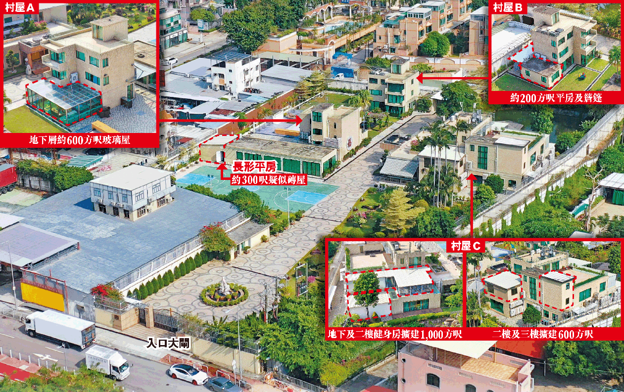 地政總署回覆本報時確認該處有未經批准擴建,亦有玻璃屋等未經批准構築物,違反地契條款。署方已向業權人發出警告信,若限期內未被糾正,會將警告信送交土地註冊處釘契,並保留進一步執行契約條款權利,同時已轉介相關部門跟進。