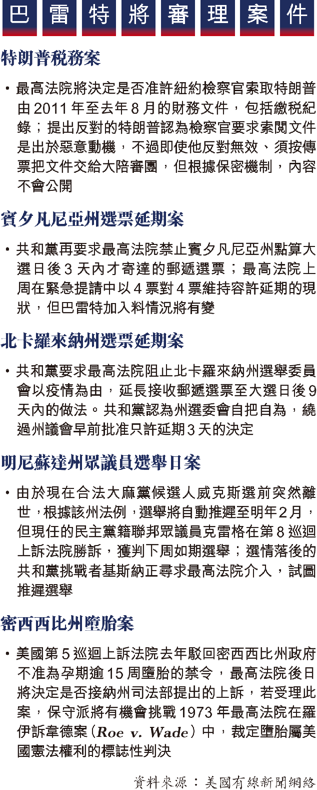 48歲的巴雷特在最高法院保守派大法官托馬斯監誓下,按憲法宣誓後展開大法官的終身任命,但昨天在最高法院正式展開工作前,再由首席大法官羅伯茨主持她的司法宣誓。她履新後首先要處理的案件,包括共和黨人要求駁回北卡羅來納州和賓夕凡尼亞州延長缺席投票限期。