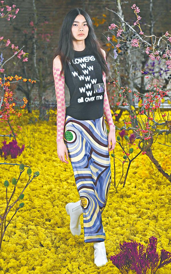服飾輪廓一貫的修長,以及放上標誌的slogan和人像圖案。女裝造型有連帽衞衣,搭配真絲半身裙;連身裙配上新鮮的漩渦狀迷幻印花袖子、oversized連帽斗篷,背心貫穿整個系列,部份造型被透明PVC細節包裹,暗藏着一份複雜性。