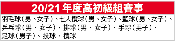 學體會亦提到,高中組賽事的種籽隊及分組抽籤會按2019/20賽季的A Grade學界比賽成績而定,若上季賽事遭腰斬則參考18/19賽季的成績,初中組的分組則按18/19賽季的B Grade成績決定,而今季分為初、高中組的球類項目將不設升降班制度。另外,學體會宣佈港九區的劍擊個人賽及壁球個人賽均取消。