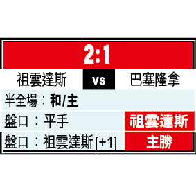 往績上,祖記近5次主場鬥巴塞取得2勝3和不敗佳績,「讓球主客和」[+1]的「主勝」可考慮之餘,平手盤亦宜捧主隊。