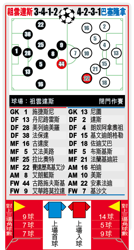 周三歐聯G組分組賽,祖雲達斯主場迎戰巴塞隆拿,原本是萬眾矚目的球王對決,但隨着祖記球星基斯坦奴朗拿度(C朗)早前確診武肺,勢無緣與美斯對決。不過祖記今季表現始終較穩定,往績上祖記近五次主場鬥巴塞也不敗,加上美斯態沉,球隊內部問題多,平手盤捧主隊。