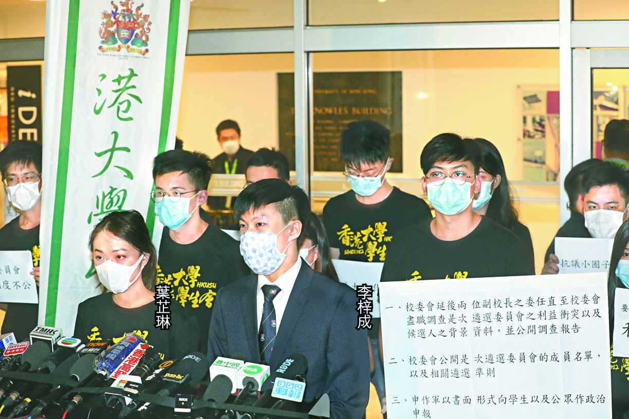 港大學生會昨午在校委會會議前發動靜坐,約50名學生參與,他們高呼「遴選制度不公,力拒黨委治校」口號,其後向教務長遞交4,200個港大學生、教職員及校友簽名,促校委會延後委任。港大11名校董發表聯署公開信,指任命將引起「黨委治校」疑慮,促校委會延後委任,惟最終無法阻止任命。