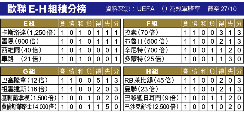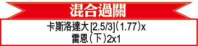 周三歐聯仍有多場賽事上演,其中E組就有英超車路士,遠征俄羅斯挑戰卡斯洛達。雖然車路士最近三連和,但論實力依然高於主隊。對手卡斯洛達近況同樣欠佳,但進攻火力仍足,主場出擊料不會死守,今場捧「入球大細」[2.5/3球]的「大」。(球賽編號:星期三11;now643、有線656及無綫myTV Super303台明日1:55am直播)