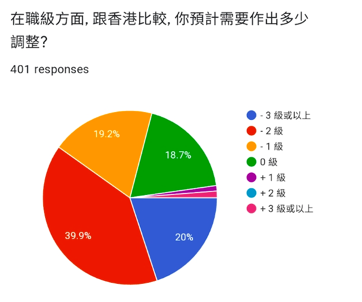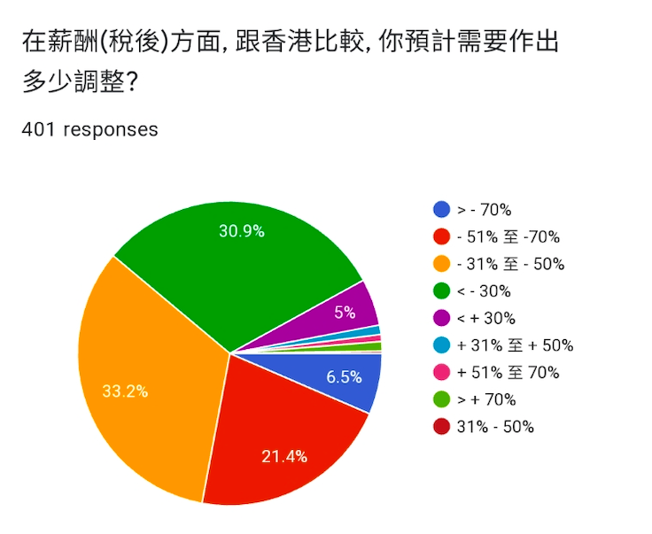 調查亦訪問了港人收入水平、預期在英國的收入,以及對調整職級的想法。調查結果顯示,月薪超過55,000港元的高收入人士佔近兩成,估計這批人士移居英國後,實質收入會有大幅度調整。因為英國稅率比香港高,年薪12,501至50,000英鎊(約126,260至505,380港元)的人士,要繳交20%稅;年收入超過50,001英鎊(約505,020港元),則要交40%稅。因此,調查結果顯示有三成人預計薪酬減少三至五成,更有超過兩成人預計減薪五至七成。不過,英國有最低工資保障,今年的時薪最少有8.72英鎊(約88港元),一般稅前最低月薪有約1,500英鎊(約15,150港元)。