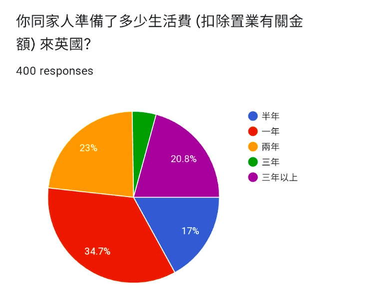 生活費方面,不少受訪者都帶備了足夠的資金來英國。扣除置業金額,35%受訪者會準備一年生活費,近兩成會準備3年生活費,只有約17%人僅帶半年生活費來英國。