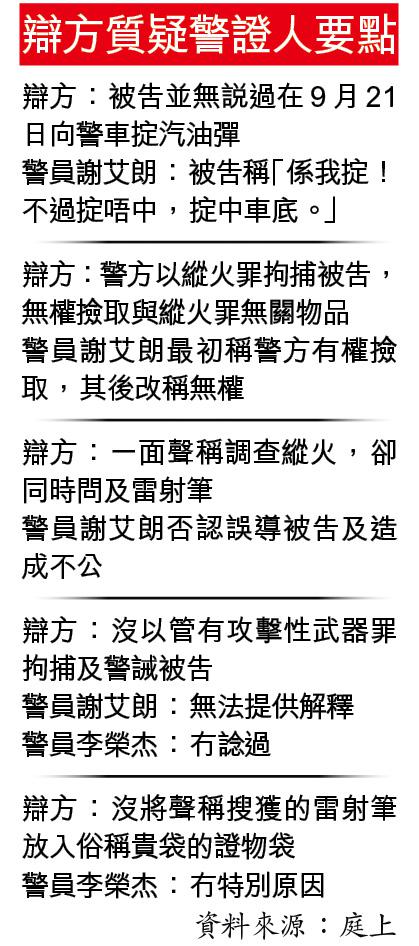 【本報訊】便衣警聲稱等候過馬路時,聽到身旁男生向朋友直認曾向警車掟汽油彈,於是截停男生,以縱火罪拘捕他。警方之後在沒搜查令下到男生住所搜屋,搜出大堆跟縱火無關物品,包括兩支雷射筆,最終以兩支雷射筆起訴男生在住所管有攻擊性武器罪,但並無就縱火罪提告。案件昨開審,有警員承認,並無就管有攻擊性武器罪名拘捕或警誡被告,亦無權撿取與縱火案無關物品。