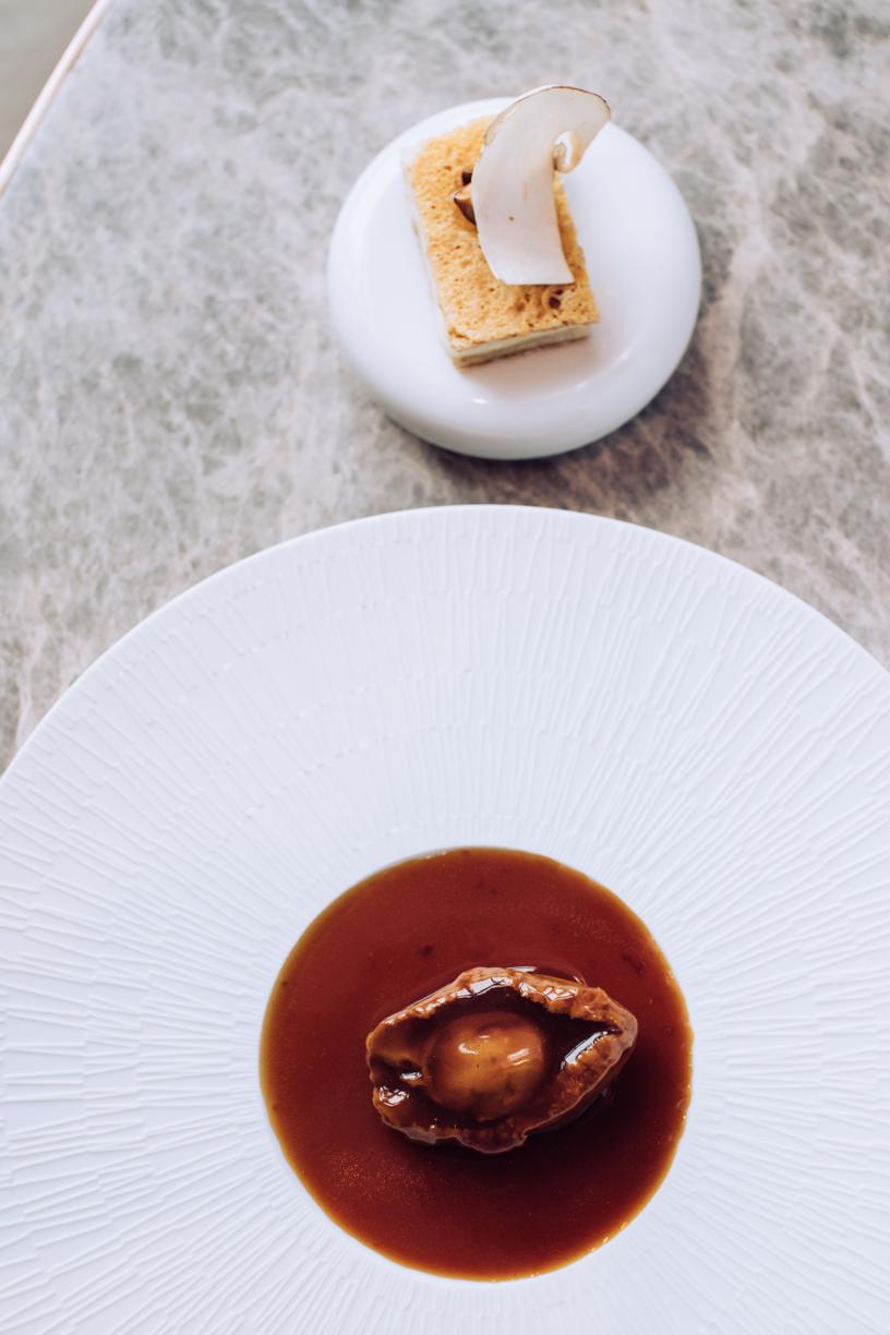 有一天,我和Vicky喝咖啡聊天,我鼓勵他研究乾鮑,並且用法式邏輯去烹製乾鮑,這將是首開先河,不但話題性十足、極具代表性,而且有了乾鮑,就能構成「海參、花膠、乾鮑」三部曲,能推進個人和餐廳品牌定位一把,甚至有助於奠定江湖地位!還記得那時候Vicky默默地聽着,有時點頭,有時沉思,沒有太多表態。沒想到,過了兩天,Vicky興奮地打電話來告訴我,他已經買了中東、南非、日本……幾個產地的乾鮑,着手鑽研,行動力驚人。再後來的故事眾人皆知,他的法式吉品皇冠批橫空出世,「三部曲」的故事也讓他的公關團隊寫了出來……