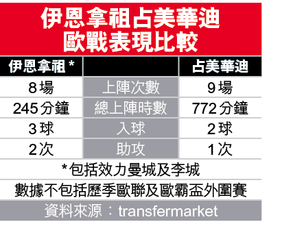 李城在上周歐霸首輪分組賽在有華迪缺陣下,憑伊恩拿祖挺身而出,交出1入球2助攻,協助球隊3:0大勝對手,這位24歲前鋒亦是首次在歐霸盃賽事取得入球。雖然華迪今季繼續交出亮麗表現,不過這位英格蘭前鋒畢竟已經33歲,領隊羅渣士希望這位老將可以保留體力專注聯賽,因此李斯特城非常需要一位具質素的後備射手在盃賽擔綱,相信伊恩拿祖非常適合擔任這個角色。