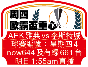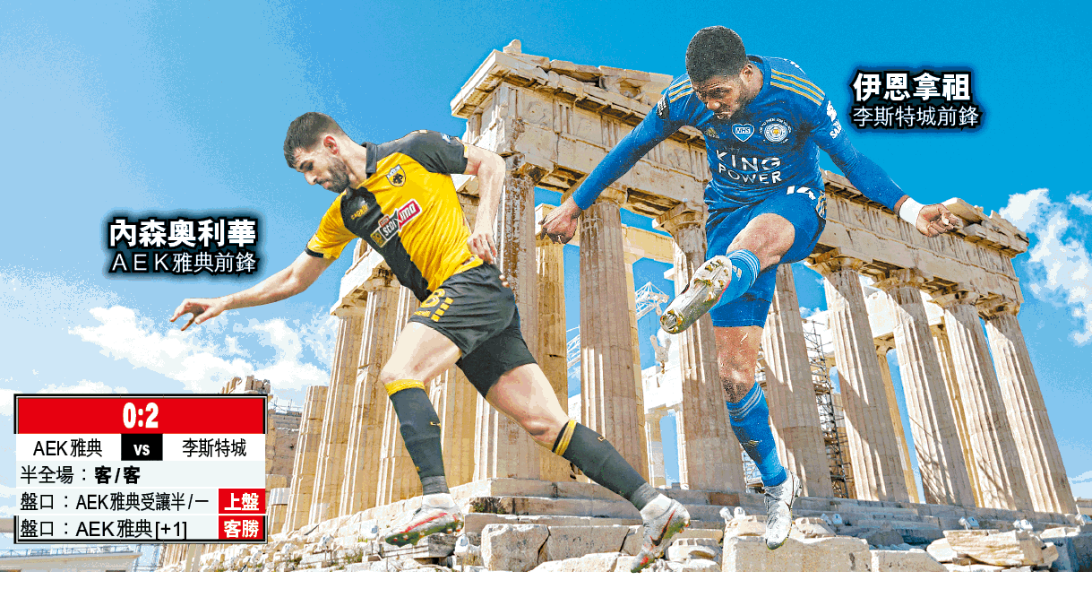 周四歐霸G組分組賽,英超的李斯特城作客希臘球隊AEK雅典。李城剛於周日本土聯賽作客一球小勝阿仙奴,士氣方面有一定提升,今仗雖然預期會收起入球功臣的占美華迪,但相信實力仍比近況低沉的主隊高,故今仗讓半/一可敲上盤。