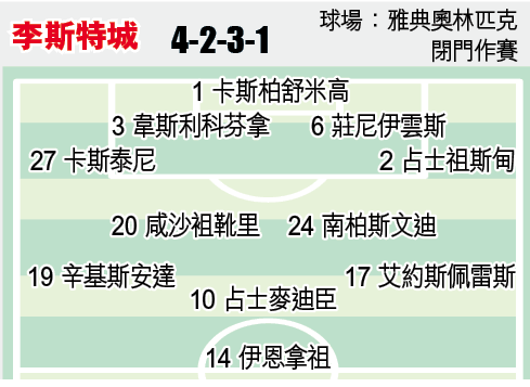 從上輪分組賽對索爾亞的比賽來看,李城對歐霸的態度頗為積極,包括占士麥迪臣、莊尼伊雲斯,以及泰利文斯等主力都悉數正選。不過,估計今仗羅渣士仍然會收起傷癒不久的華迪,繼續重用上輪有「士哥」的伊恩拿祖攻堅。另外,上仗後備入替並交出助攻的辛基斯安達,今仗亦有機會得到加盟以來的首次正選機會。接下來李城將要連續兩輪硬撼葡超的布拉加,為免夜長夢多,今仗必力爭再取三分。