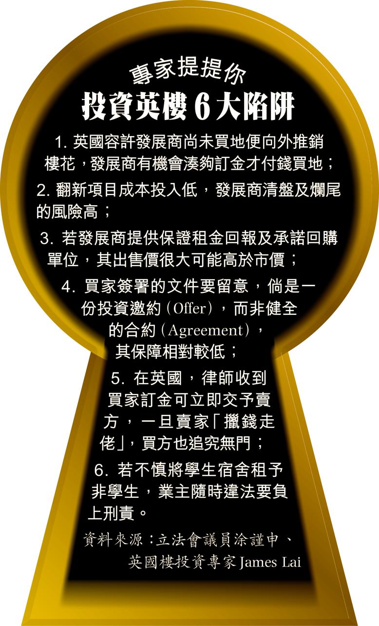 港人移民英國氣氛熾熱,有移民顧問公司稱,今年下半年港人海外置業數字比上半年急升六成,惟「隔山買牛」問題多多。據地產代理監管局資料,過去兩年多接獲七宗英國爛尾樓盤的投訴,立法會議員涂謹申正處理至少20個爛尾樓盤個案,包括轟動一時的爛尾樓騙局Angelgate,以及學生宿舍Spectrum、Quadrant、Paramount,酒店項目Dockland、Wembley等,而這情況僅是冰山一角。