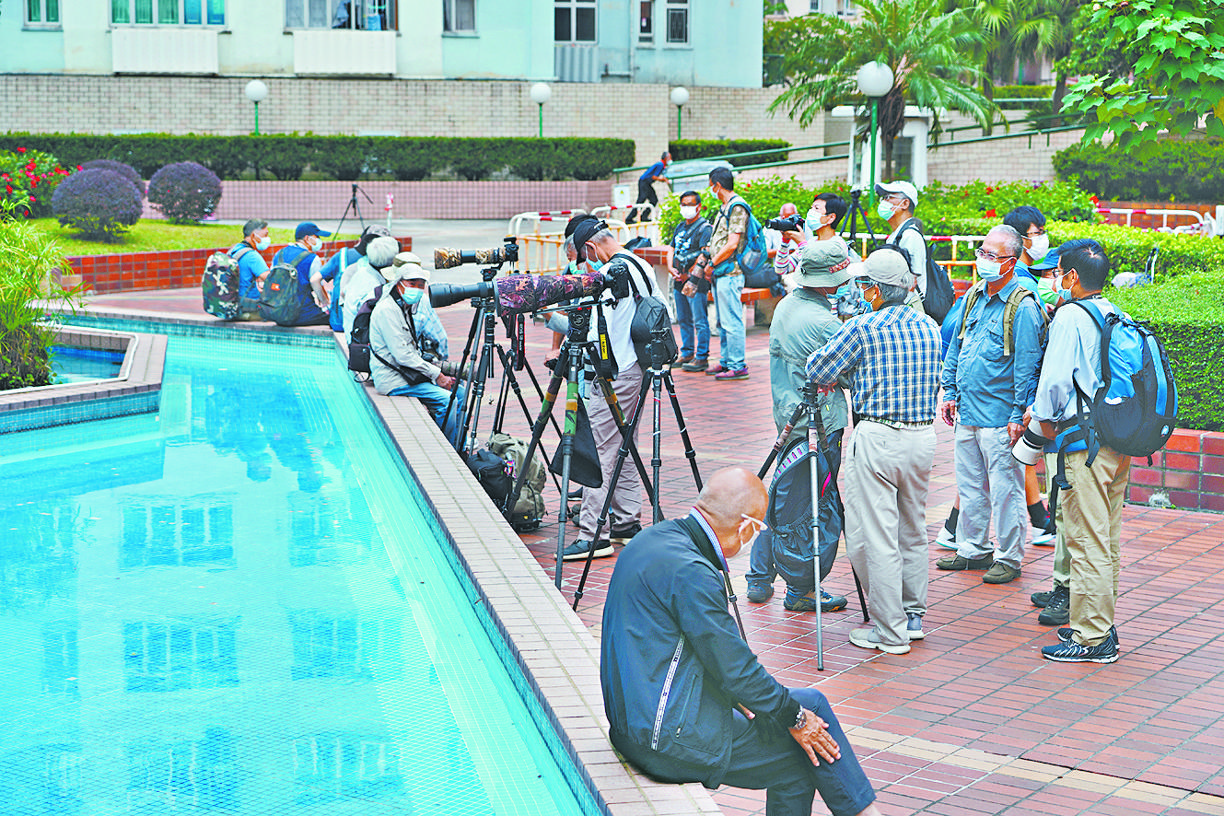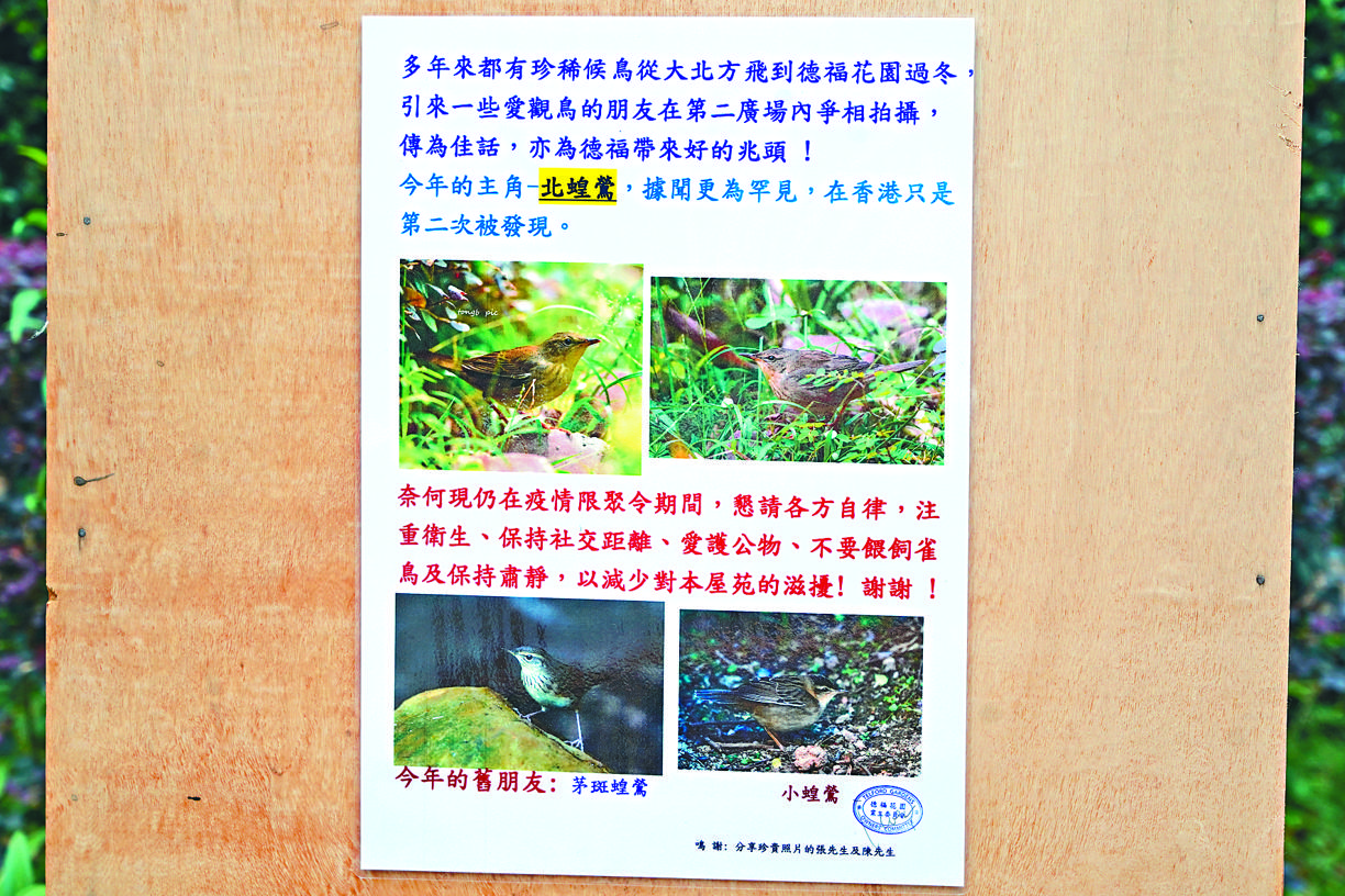拍攝雀鳥超過20年的Peter昨日清晨已來到德福花園,成功拍下極少來港的淡腳樹鶯。他說德福花園交通方便,因此吸引眾多雀鳥攝影師到來,北蝗鶯和淡腳樹鶯均是十分難見的雀類,「一匿埋就冇,呢度會易搵好多,所以有就一定要嚟。」