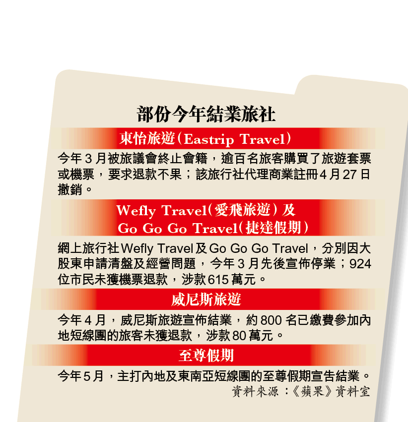 旅行代理商註冊處表示,截至前日有1,718間持牌旅行代理商;旅議會表示,今年首九個月已有73間旅行社倒閉,大部份都是中小型旅行社。有業界人士稱,經營內地團為主的達美旅遊本身有經營困難,內地封關零外遊團或成致命一擊。名褘則主要售賣旅遊套票,受旅遊網站打擊,疫情下經營更雪上加霜。