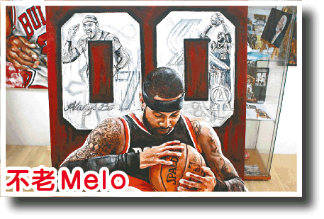 背景:2003年選秀探花安東尼(Carmelo Anthony)經歷被火箭裁走的低潮後,上季終在拓荒者迎來第二春,打出場均15.4分、6.3個籃板、1.5次助攻,更助球隊打入季後賽。雖然數據未算亮眼,但其勵志故事已令包括Roy在內的不少球迷動容:「高中時他與勒邦占士(LeBron James)齊名,現時占士依然是NBA最頂尖球員之一,有四隻冠軍指環,安東尼雖沒班落,但依然做好準備回歸聯盟,最終以好表現回應外界質疑。」Roy以其「00」新球衣號碼為創作靈感,加入其低頭抱緊籃球的動作、三分球慶祝動作、優美跳投姿態,望以畫作講述安東尼爭氣重生故事。