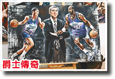 背景:Roy過往一直希望以爵士經典二人組「郵差」馬龍(Karl Malone)及史托頓(John Stockton)為題創作。直至今年5月,傳奇教頭史龍(Jerry Sloan)因病離世,促成這幅作品。史龍執教爵士逾20載,為球隊帶來逾千場勝仗,更加將Pick & Roll(擋拆)戰術發揮得淋漓盡致,Roy亦特意在作品中加入戰術板的元素,紀念這位「擋拆教父」:「有時看比賽除了場上的球員外,教練其實都舉足輕重。史龍在爵士經歷不少起跌,雖然未得總冠軍,但仍是個值得尊重的偉大教練。」