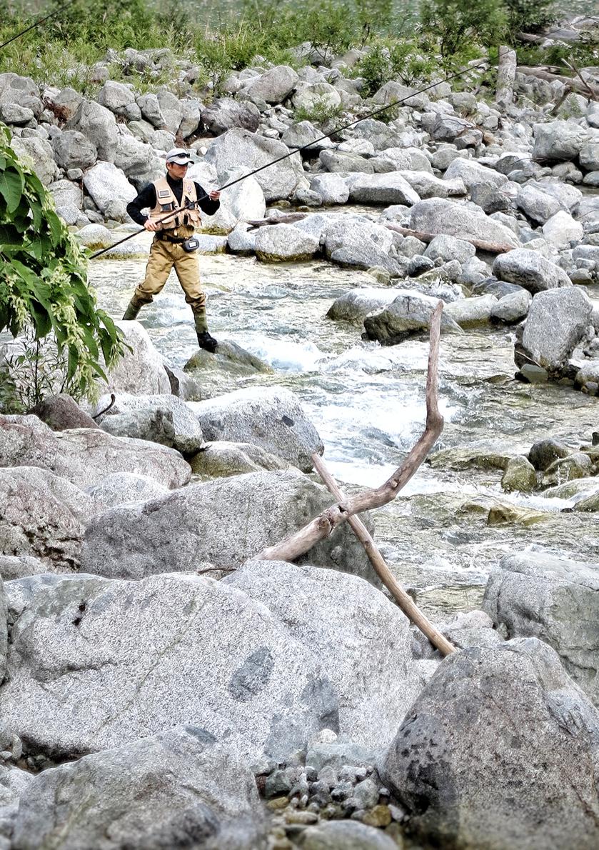 テンカラ在台灣譯作「天唐釣」,以手竿配合精細的「飛蠅」假餌,最適合溪釣,飛蠅又稱毛鈎,在魚鈎上用羽毛或人造材料綁製成昆蟲模樣,傳統上釣客會自己親手製作,方式千變萬化,同時也是一種精緻的本土傳統工藝。本想見識一下傳統的天唐釣法,可惜沿途所見,釣客都在湖邊用超長手竿和海竿。路上遇上一位正在回小屋的釣客,好奇看看他桶中收穫如何,他也樂意展示,最大收穫是一尾虹鱒,還有六、七尾岩魚,都是常見品種,似乎很滿意,不過來黑部川的釣魚客,更希望釣到的是名叫「山女」的鈎吻鮭魚,一種終生以陸封型(成長後不會回游大海)的櫻花鈎吻鮭,與台灣雪山下大甲溪上游的櫻花鈎吻鮭,體形與生態上都十分相似。