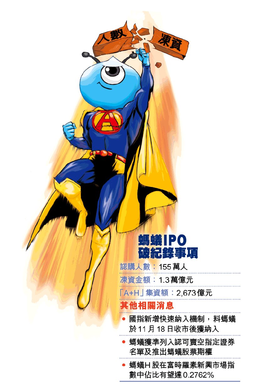 至於恒指,按該快速納入機制要求,即使公司市值在港股五大,仍需上市最少3個月,意味螞蟻最快明年2月的恒指季檢後才可「染藍」。另外,國際指數公司富時羅素稱,螞蟻H股在富時羅素新興市場指數中佔比有望達0.2762%。港交所(388)亦指,螞蟻獲准列入認可賣空指定證券名單,同時推出螞蟻股票期權。