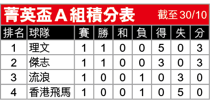菁英盃今日上演A組第二輪賽事,頭場由理文對傑志,尾場則為流浪鬥飛馬。前季於此賽奪冠的理文,上場菁英盃首戰令人驚喜地在缺少尼迪利及基華尼頓等主力的情況下,半場在飛馬身上連轟五球,當中前鋒梁嘉恆射入1球兼交出2次助攻,教練曾昭達表示:「球隊今季加入不少新球員,首戰能大勝感驚喜,希望此戰續有表現。」