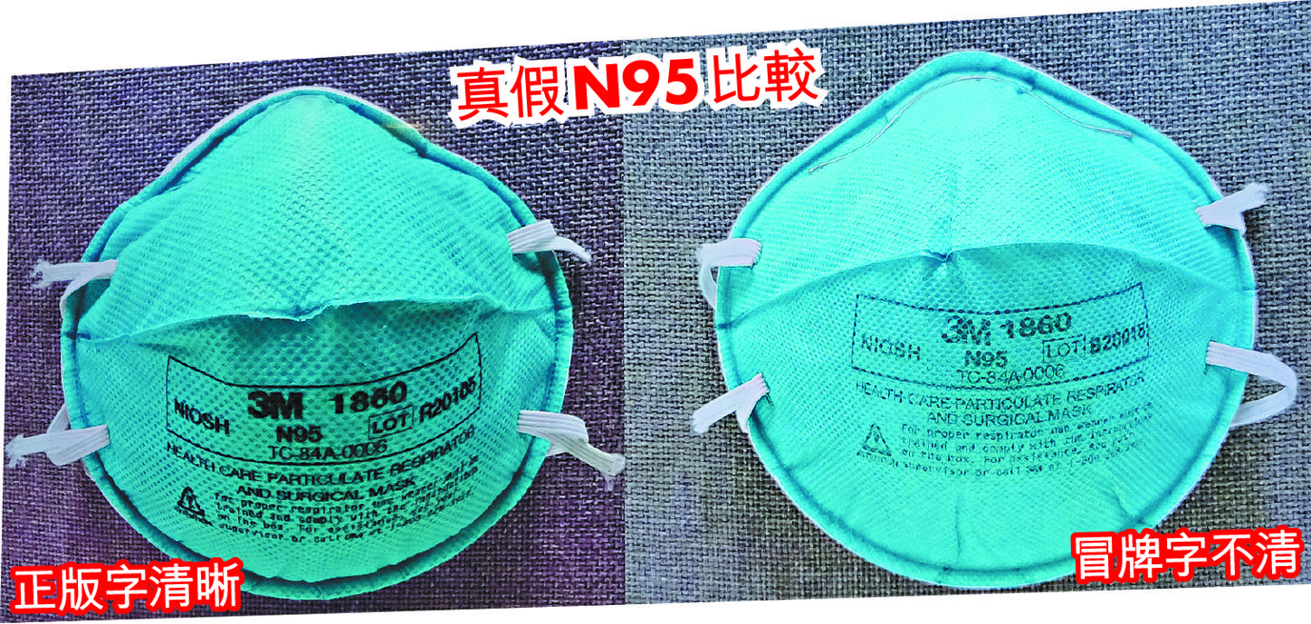 今次撿獲的10萬個冒牌醫療級口罩,屬假冒3M 1860 N95口罩型號。海關指這批冒牌罩仿真度高,無論顏色、尺碼或耳繩橡筋釘裝等都與正貨十分相似,而且紙盒印刷精美,但正貨口罩上編印的字體清晰,相反冒牌口罩表面的字體印刷模糊粗糙,幾乎看不清字樣;冒牌罩的厚薄亦與正貨有輕微差異。涉案冒牌口罩並非在香港生產,包裝及盒上防偽貼紙亦與本地銷售的正貨不一樣,估計暫未流入本港市場。