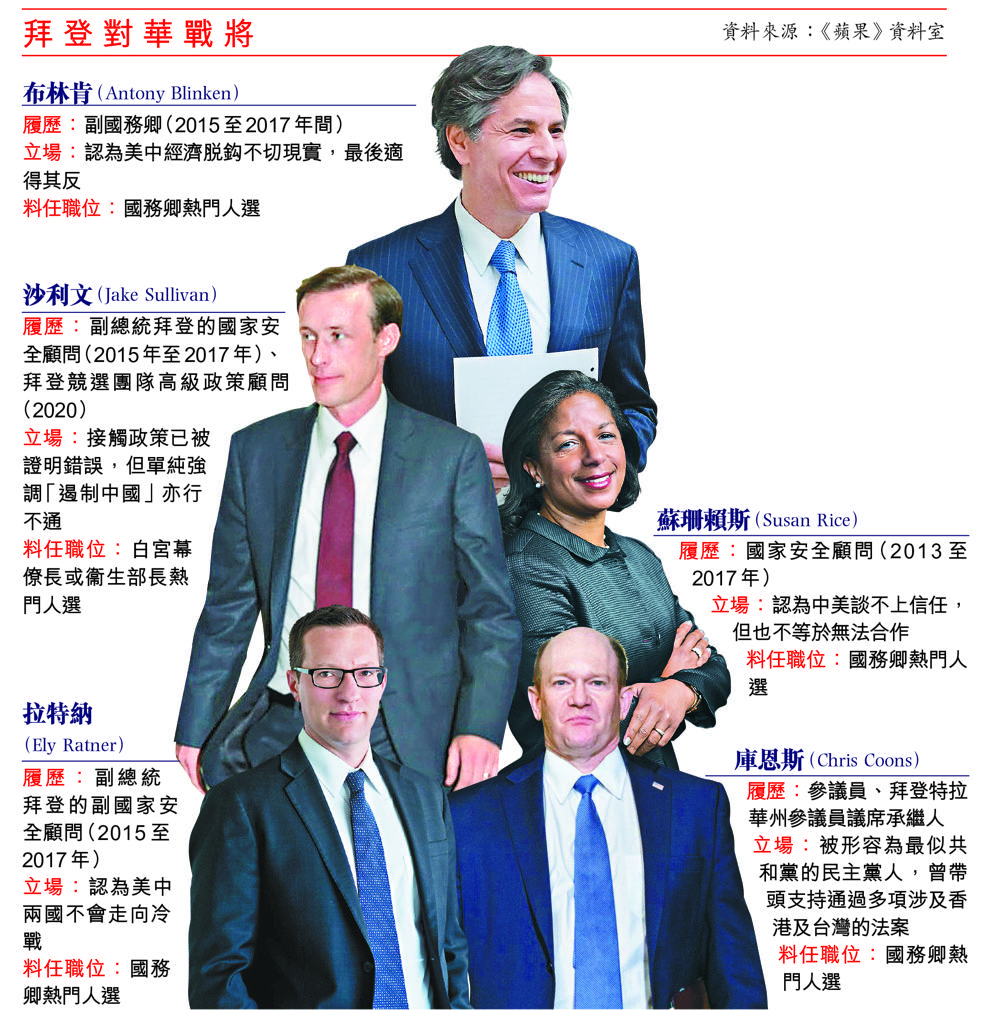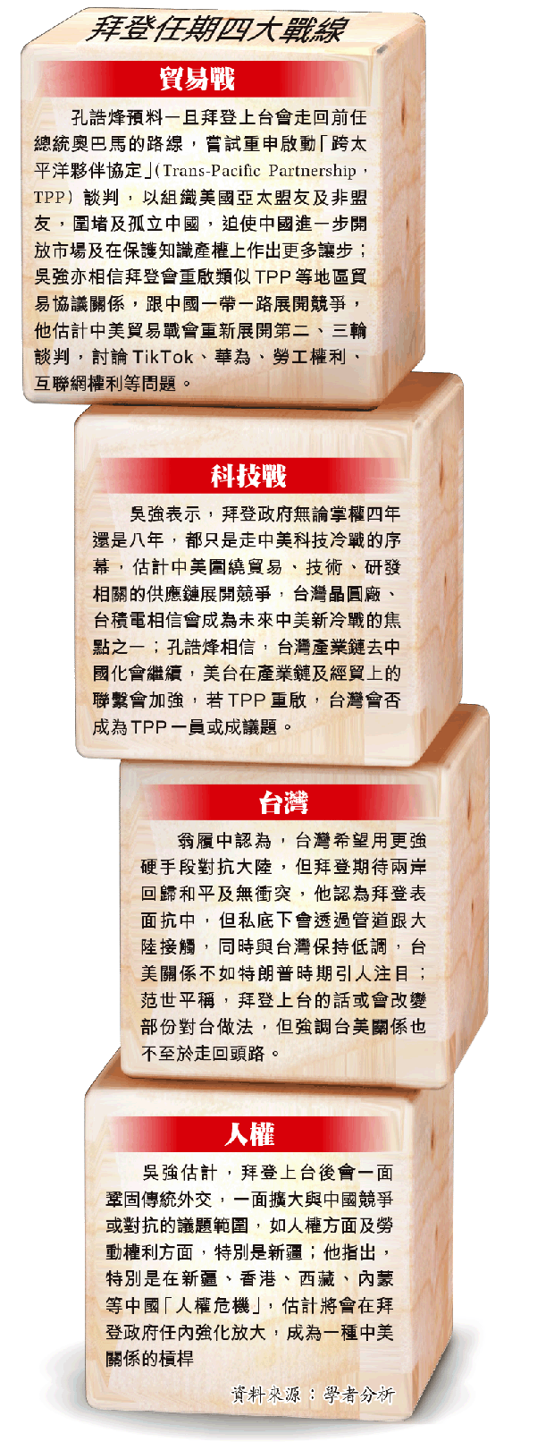 【本報訊】美國政壇變天,美國對華政策將告別單邊主義,回歸以多邊主義為核心的中美對抗。華人反共圈擔心,拜登政府將重演接觸政策下的綏靖而放虎歸山。內地學者指出,中美新冷戰格局已形成,對華強硬是美國共和民主兩黨共識,拜登政府將發起「對華政策的一種強大的、全世界的動員」重構全球秩序。分析指出,假如拜登真的對中國有特殊偏好,美國國會與國家安全體系的巨大力量,不會輕易讓他的偏好影響美國對華強硬的大方向。